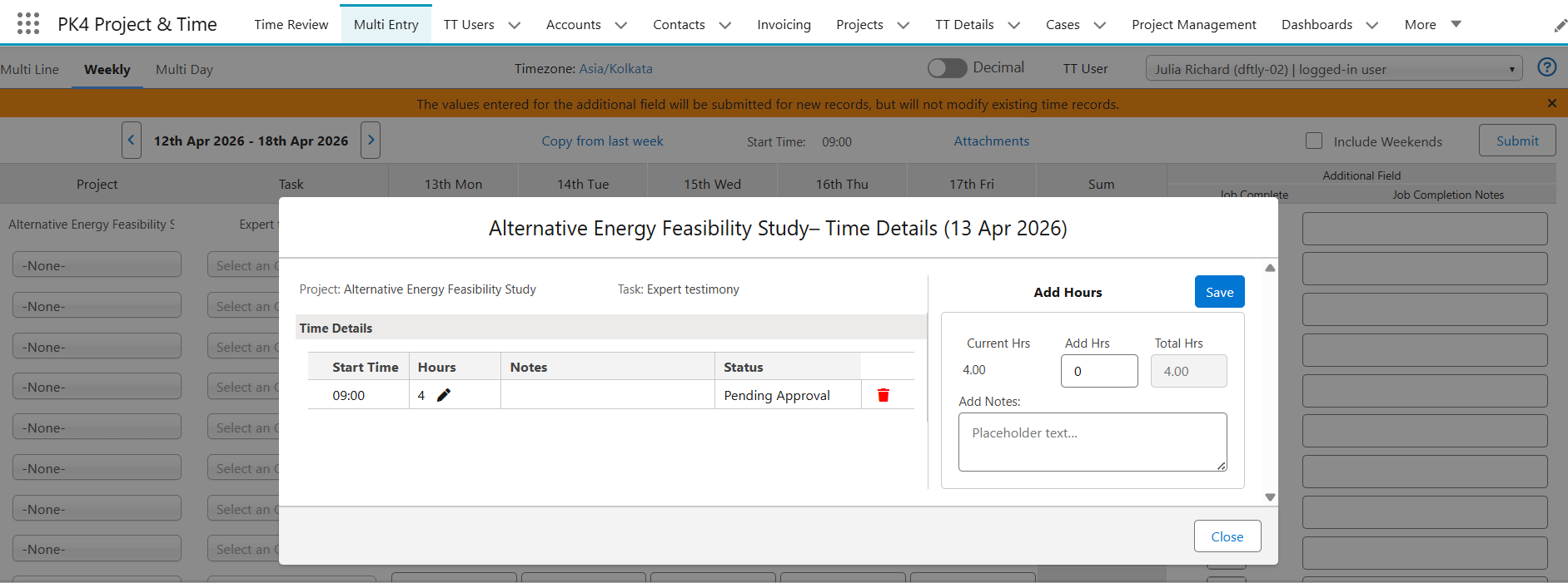- If you want to add additional hours to the older time entry use the Add Hours section in the edit page, and submit the time.